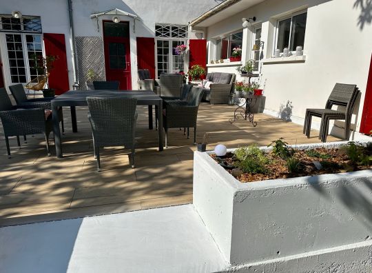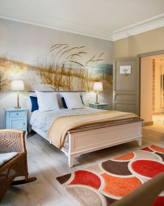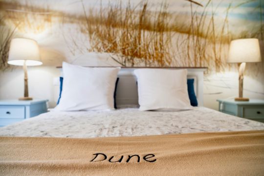 Dune est une grande chambre double de 25 m2 donnant sur la terrasse équipée d'un lit double de 160x200, une salle de bains (douche et WC). Porte fenêtre moderne double vitrage
